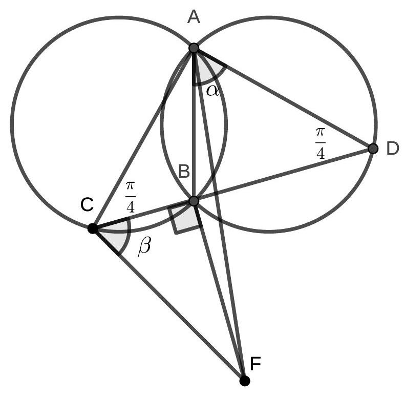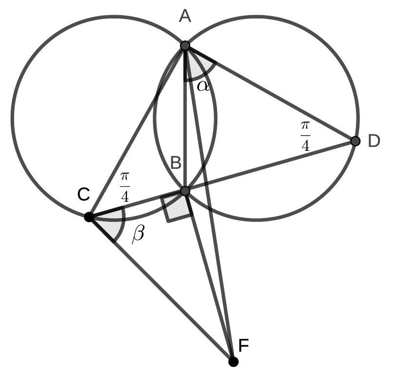 6. [6 points] a) Two circles of the same radius 10 intersect at points $A$ and $B$. On the first circle, a point $C$ is chosen, and on the second circle, a point $D$ is chosen. It turns out that point $B$ lies on the segment $C D$, and $\angle C A D=90^{\circ}$. On the perpendicular to $C D$ passing through point $B$, ... | Answer: a) $C F=20 ;$ b) $S_{A C F}=196$.