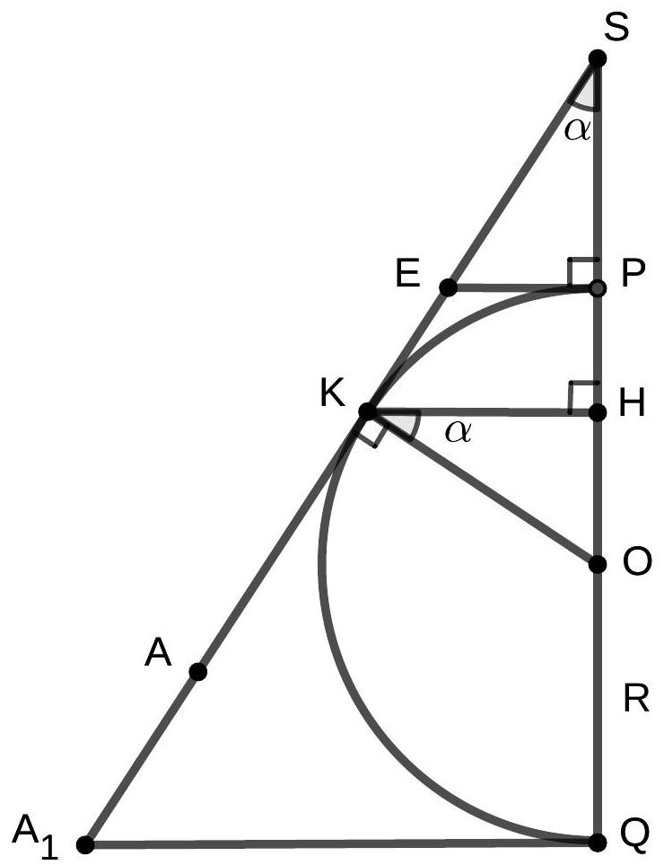 Solution. Let the points of intersection of the line $S O$ with the sphere be $P$ and $Q$ (point $P$ lies on the segment $S O$, and $Q$ lies outside it). Let the radius of the sphere be $r$. Triangles $O K S, O L S$, and $O M S$ are right triangles (angles... | \angleKSO=\arcsin\frac{1}{5};S=\frac{144}{25} | Geometry | math-word-problem | Yes | Yes | olympiads | false | 3,547 |