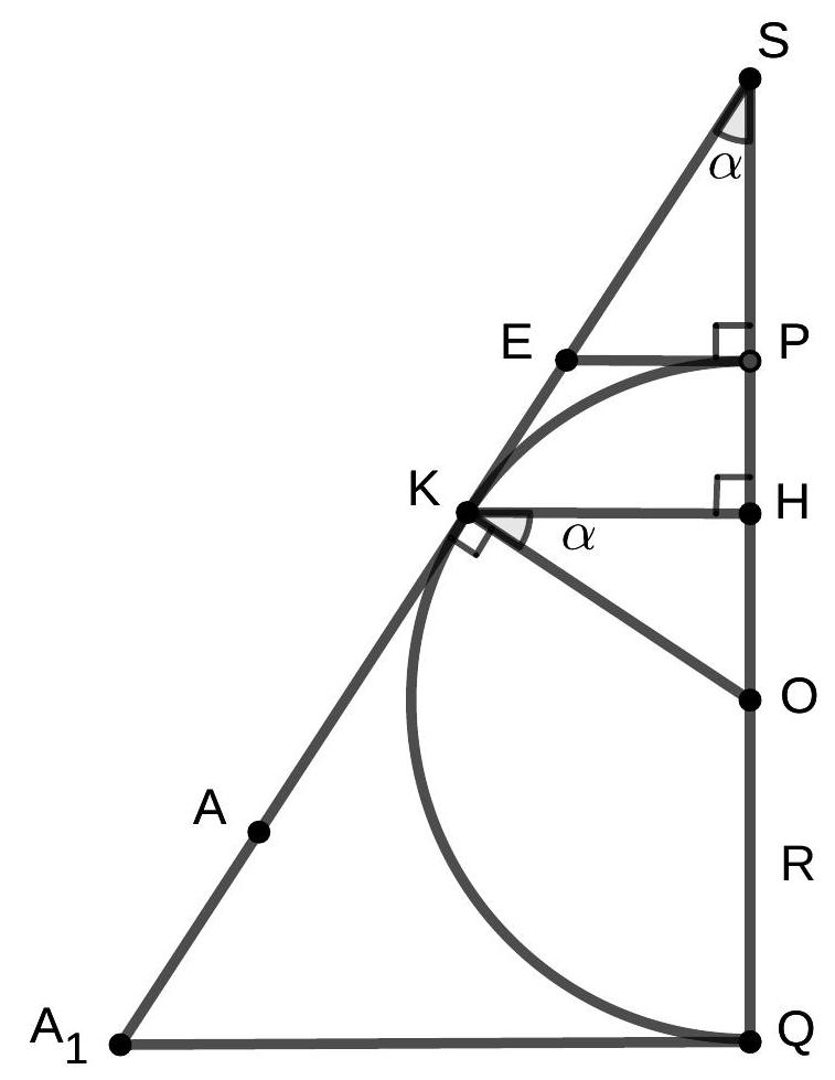 Solution. Let the points of intersection of the line $S O$ with the sphere be $P$ and $Q$ (point $P$ lies on the segment $S O$, and $Q$ lies outside it). Let the radius of the sphere be $r$. Triangles $O K S, O L S$, and $O M S$ are right triangles (angles at... | \angleKSO=\arcsin\frac{1}{3},S=\frac{16}{9} | Geometry | math-word-problem | Yes | Yes | olympiads | false | 3,541 |