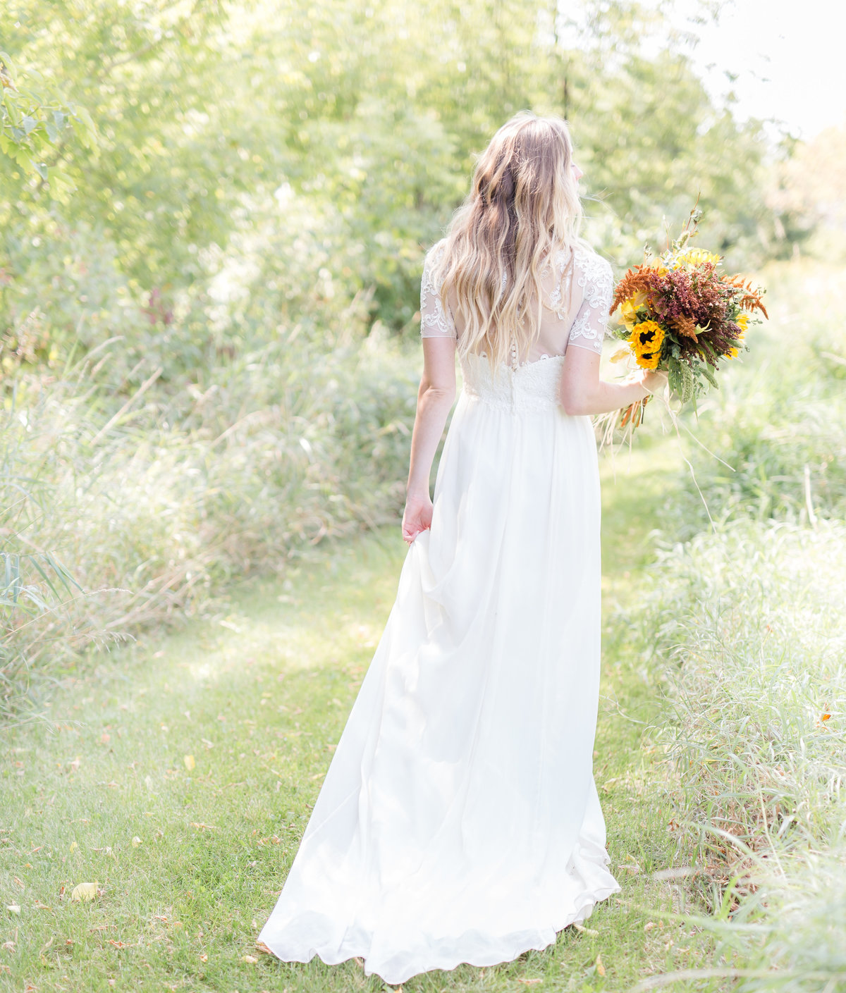 bride stands in stark sun patch of light at otter lake lodge | |||