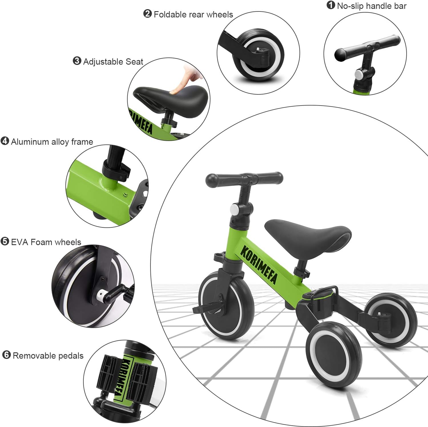 KORIMEFA 3 in 1 Triciclo Bambini 1 Anno Bicicletta Senza Pedali 2 Anni Bambini Triciclo per Bambini 1-3 Anni (Verde) Verde+