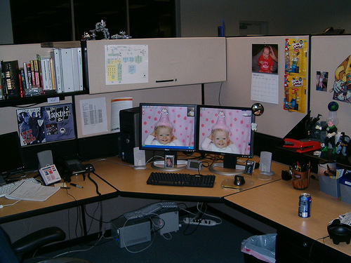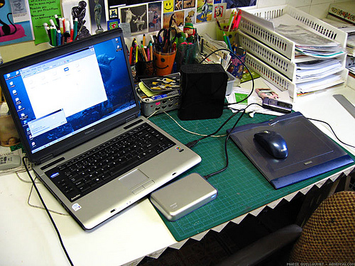 There is a stack of hardcover and paperback books on a table with an almost empty bottle of Corona beer sitting next to them. Beneath the stack are magazines scattered randomly. Leaning against the stack is a paperback named "Watchmen". A white mouse sits behind the books next to a green lizard statue. Behind all these items is a white computer monitor that is turned off.