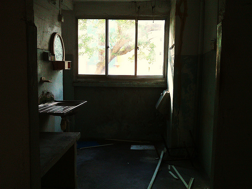 An empty room has debris on the ground. There is no furniture in this room. There is a long shelf on the wall, and some other decoration hanging above the shelf. There is a triple window at the end of the room, with no curtains. Sunlight is coming in through these windows.