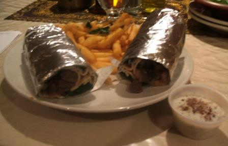 A white round plate is on a table with a plastic tablecloth on it. Two foil covered food halves are on the white plate along with a serving of golden yellow french fries. Next to the white plate in a short, topless, plastic container is a white sauce. Diagonal to the white plate are the edges of several other stacked plates. There are black shadows reflected on the table.