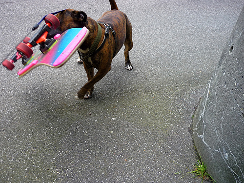 A small short haired brown dog walks down the street, holding a skateboard in its mouth. The board's underside is pink and aqua. Its wheels are red. The dog has a body collar on it. Its body has black spots.