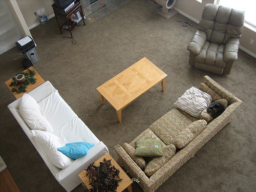 A dark red pot is sitting on a granite table. In the red pot is a pile of rocks with white flowers dispersed in the rocks. There is a white pot that is empty on the table along with a knife with black handle. Living room furniture is in the next room near the pots. The furniture is an off white color with blue carpeting.