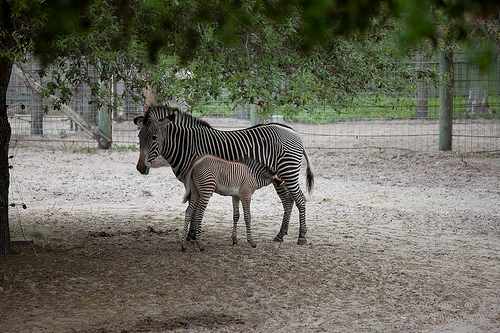There is a zebra in a field that has another young zebra underneath it. There is a fence behind the animals and leaves above them from a tree.