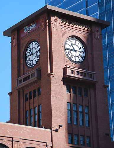 The clock is encased in a red brick. It is near a large glass skyscraper. The numbers on the clock are in roman numerals. The numbers are also black. The sky behind the clock tower is blue.