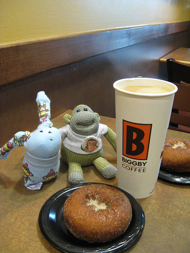 Two donuts sit on black plastic plates in a coffee shop called Biggby Coffee. A full, tall disposable coffee cup with the shop name on it sits in between the plates. There are two small stuffed animals on the table near the wall.
