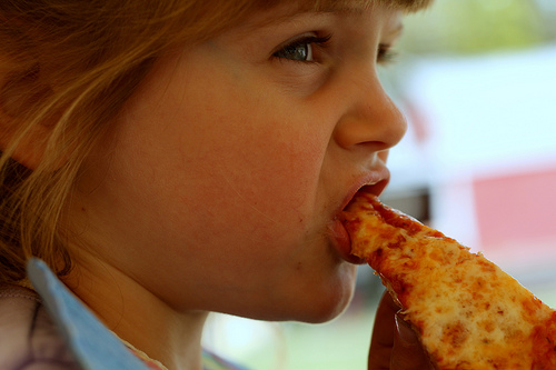 The little girl is biting into a piece of cheese pizza. The girl has blonde hair and blue eyes. The backround of the picture to the left of the girl is blurry. The tomato sauce is a vibrant red color.