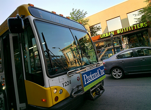 A white and yellow public transportation bus with "122" on front is stopped with it's doors open. There is a gray car on the street beside the bus. Behind the car there is a building with an "Urban Outfitters" on the first floor.