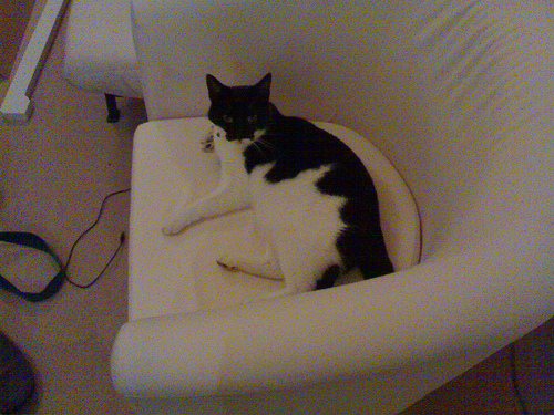 A black and white cat is sitting in a white chair. The cat is looking up at the camera. There is a black cord and a black strap on the floor in front of the chair. There is another piece of white furniture next to the chair.