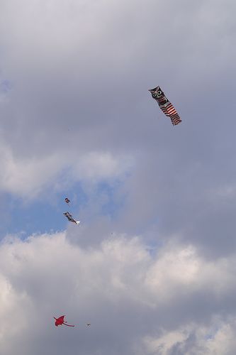 Several kites fly in the air. The brightest kite is red and has a long tail. One kite has red and white stripes. The sky is cloudy and overcast.
