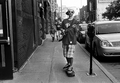 A man is wearing a hat and riding a skateboard. He is holding a guitar. He is on the sidewalk next to a street with several cars parked on it.