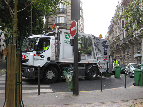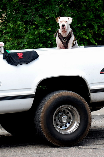 A white truck is driving on a street. There is a white dog in the back of the truck. There is a black shirt draped over the side of the truck. There is a tree behind the truck.