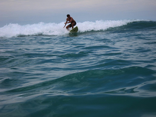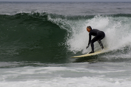 This is a man surfing in the ocean. The man is wearing a black full body wetsuit. He stands on a white solid colored surfboard and is bend down for balance. A large wave is directly behind the man and pushing him forward.