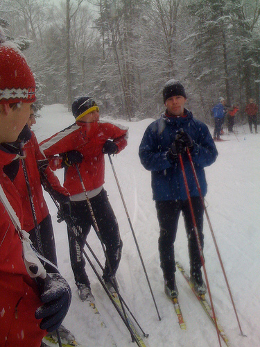 A group of men stand in the snow with skis. There are many snow covered trees behind the skiers. There is another group of men off in the distance. The skiers are all dressed in warm clothing. The sky above them is gray.