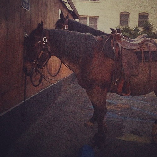 Two brown horses are standing together outside. There heads are up against the side of the building. The both have saddles on. They are standing on concrete.
