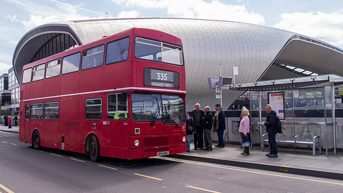 There is a two story red bus sitting next to a bus stop. The red bus has many windows on both stories. There is a marque on the front of the bus with numbers on it. There is a woman in pink waiting to board the bus. There is a large, modern building sitting behind the red bus.