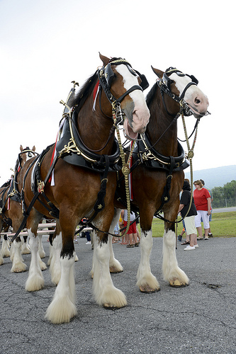 A few huge Clydesdale horses stand waiting with harnesses to a vehicle that cannot be seen. They all have white hairy legs and brown hair. On the front of their heads they have a broad white stripe. The harnesses are black leather with gold trim. People stand in a group behind them.