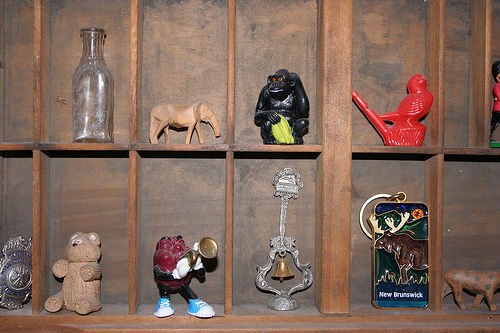 A bunch of statues are displayed on a shelf. The shelf is a rustic wooden color. All of the statues are of animals except for the bell and empty bottle. The collection is very nice looking.