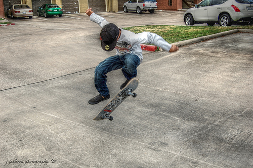 A boy is practicing his skateboard moves outside of a driveway. The cars parked behind him indicate that he is in front of a motel or an apartment house. The boy is dressed in blue jeans and a gray sweatshirt with a silkscreen print on the front, thought it can't be made out what it is. He is wearing black skater shoes and a baseball cap. His face can't be seen because it is blocked by the hat's bill. He is very intent on learning this turn on flat ground.