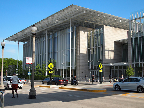 A large building with bars on the windows in front of it. There is people walking in front of the building. There is a street in front of the building with many cars on it.