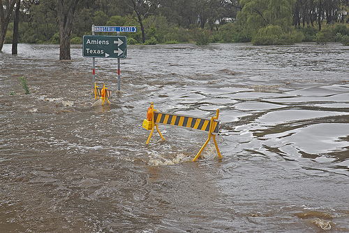 A street is flooded with brown water. The water is slightly choppy. There is a yellow and black traffic post in the water. There are traffic sign indicating the direction of cities. The sign is green. Over it is a blue street sign. Trees surround the area.