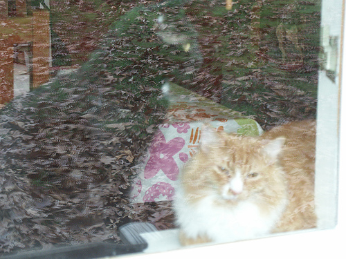 The cat is sitting on the floor. The cat has tan and white fur. The cat has its eyes open a little. There is a fuzzy background in the photo. The photo was taken indoors near a window.