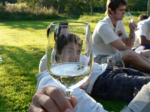 There are people sitting on the grass. There are trees behind them in the grass. There is a man in a white shirt holding a wine glass up to his mouth.