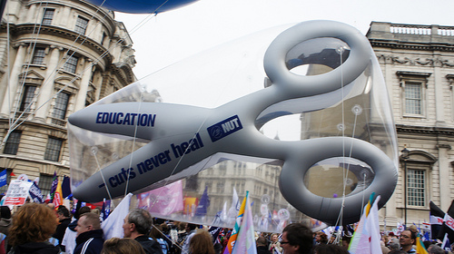 A bunch of people are supporting a parade. There are a lot of people located everywhere in the picture. There is a small balloon/blimp that says "Education - cuts never heal".