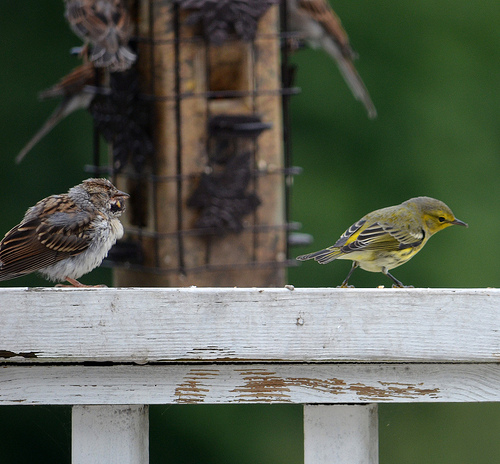 A white wooden fence has two birds standing on it. There is a small yellow bird and a small brown and white bird. There is a wooden bird feeder behind them.