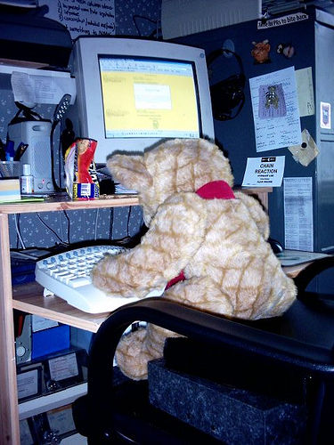 A light brown teddy bear is sitting in a black chair. There is a white keyboard on the desk in front of them. There is a computer monitor on the desk above the keyboard that is turned on.
