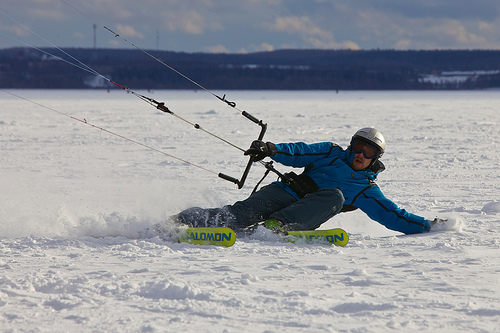 A person is hold a rope and falling to the ground. The person has on a blue jacket and a white hat. The person has green skis on his feet. The person is lying in the snow.