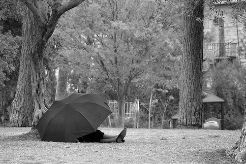 a woman is laying in the grass. she is laying under an umbrella. the umbrella is black in color. the woman is wearing heels. she is also wearing a dress. there are trees surrounding her.