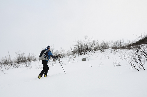 There is a man on cross country skis skiing through a field of snow. The man is wearing black pants, a blue shirt, a hat and has a backpack on his back. He is holding ski poles. It is daytime out, but the sky is gray and overcast. There are bare twigs sticking up from the ground.