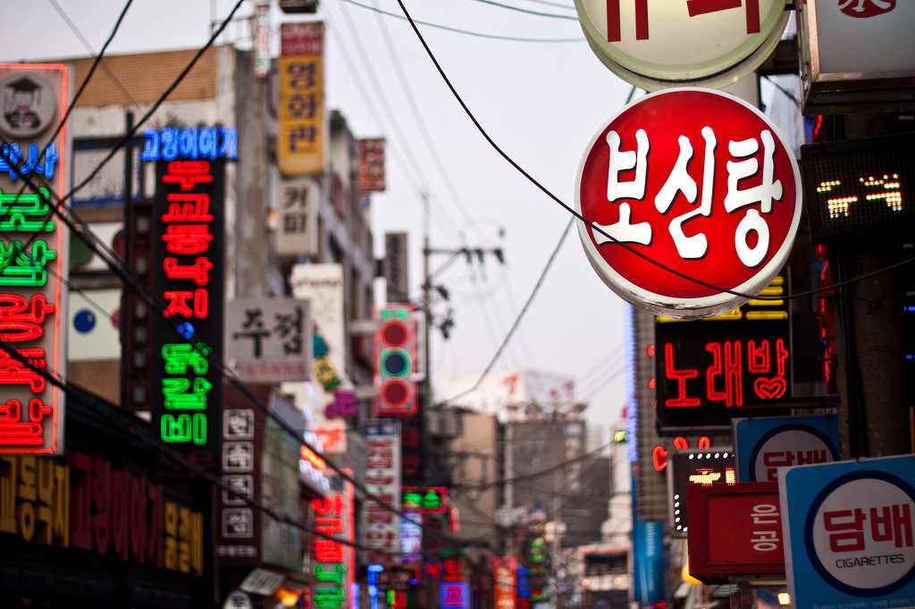 A busy city street on a cloudy day is seen. There are business signs lining the buildings on both sides of the street. The signs are bright and neon glowing signs mounted on buildings and written in a foreign language. Over the street power lines are crisscrossing.