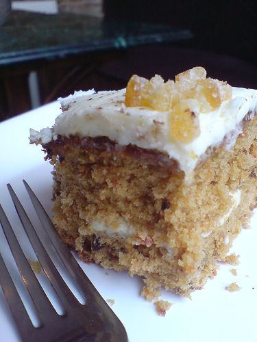 a piece of cake is on a plate. the cake is light brown. the icing is white in color. there is a topping on the cake. the fork is large and pointy.