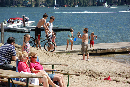 A group of people are at the beach. Two women are sitting in blue beach chairs. They have blonde hair, pink shirts, shorts and are wearing sunglasses. A man is sitting behind them at a picnic table in denim pants and a blue and white stripped shirts. A shirtless boy is pushing a bike along side a young man. Four small children play near the shore. The two boys are shirtless and wearing shorts and the girls are wearing bathing suits.