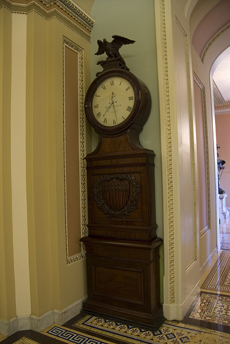 A large wooden clock is sitting on the floor. The wall behind the clock is painted blue. The clock on is white with black numbers.