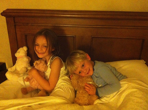 two kids are sitting in a bed together. the two kids each have teddy bears. there is a little blonde boy next to the little girl.