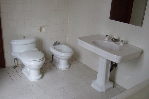 A very clean and tidy a bathroom. Everything is a neat porcelain white. This bathroom is both retro and modern.