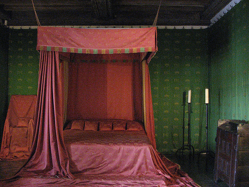 A lovely large bed with 5 throw pillows. The bed is made with a large satin comforter and satin drapes around a canopy. The walls around the bed have large green curtains hung up by tabs. There is a piece of wooden furniture to the right of the bed and to the left of the bed there appears to be a chair covered in satin also.