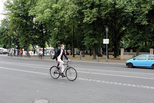 A man is riding a bike down a street. He is wearing a black jacket and his bike is also black. He has brown hair and black boots. There is one lone car on the road and it's bright blue. Full trees line the street.