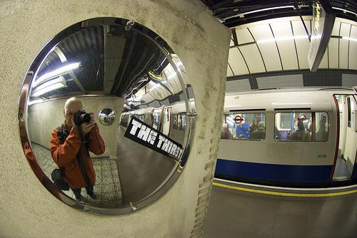The man is taking a photo in the round mirror. He is bald. He is wearing an orange jacket. His camera is black. There is a train in the mirror too.