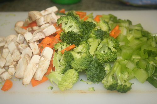 On a white plastic cutting board is a bunch of chopped vegetables. On one side are chopped mushrooms they are a white color. On the other side are some bright green chopped broccoli. In the middle are bright orange chopped carrots.