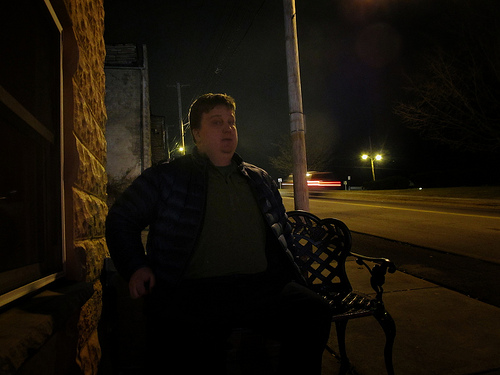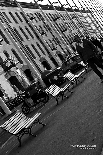 A man is walking near a row of benches. The photo is in black and white and the buildings are too. There is a motor bike parked on the other side of the row of benches.