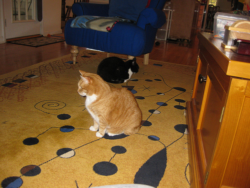 Two cats are in the middle of a tan area rug with navy blue shapes. The first cat is tan with a white chest and white paws. In back of that cat, is a black cat with a white chest. It is crouched low to the ground. Behind the cats, sits a royal blue arm chair with a folded throw cover, a door with a welcome mat laying in front of it. A wooden cabinet with accessories is on the side of the cats.