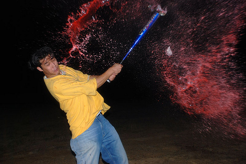 A man with black hair is swinging a bat. He has just hit something filled with red liquid with the blue bat. The air is filled with the explosion of red water. He is wearing a yellow shirt and blue jeans.