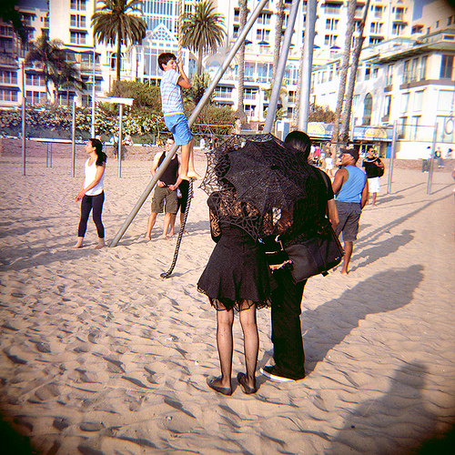 People are on a play ground standing in the sand. A boy in a blue shirt and blue pants are climbing the pole. The woman in brown is holding a brown umbrella. There are people shadows on the ground.